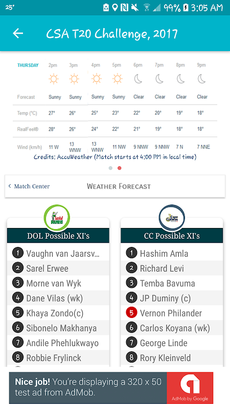 Aplicación para conocer los equipos que juegan11 y los detalles de la alineación de un partido de cricket.