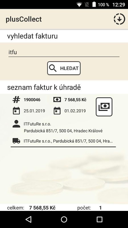 Solicitud del sistema de contabilidad Pohoda solía encontrar facturas impagas de los clientes con la posibilidad de pago inmediato en efectivo, incl. emitiendo un recibo EET.
