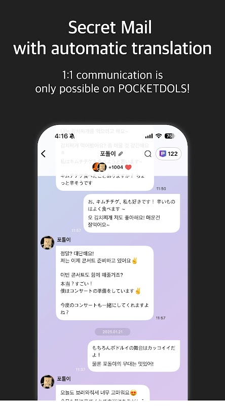 ▶Acércate a tus artistas favoritos en cualquier momento a través de Secret Mail, incluso al otro lado del mundo. Envía tus propios mensajes y muestra tu apoyo a tus sesgos.