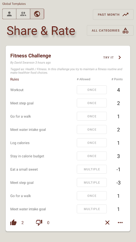 En Pointagon, un desafío consiste en un conjunto de reglas que te esfuerzas por completar cada día. Las reglas pueden ser lo que quieras. Cada regla tiene un valor en puntos asociado. También tiene la capacidad de especificar si la regla se puede terminar una o varias veces en un día. Para comenzar un desafío en la aplicación, complete un formulario simple e invite a sus amigos y familiares. Después de eso, registra sus puntos ganados cada día. ¡La persona con más puntos al final del desafío gana!