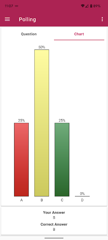 • La pantalla muestra las respuestas del grupo, la respuesta del usuario e indica la respuesta correcta cuando se cierra el sondeo