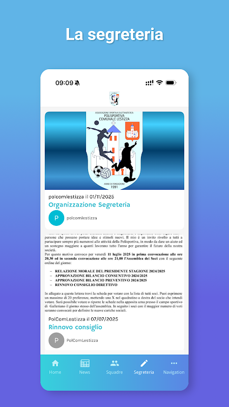 Eventos, sesiones de entrenamiento y anuncios del Club Deportivo Municipal de Lestizza.