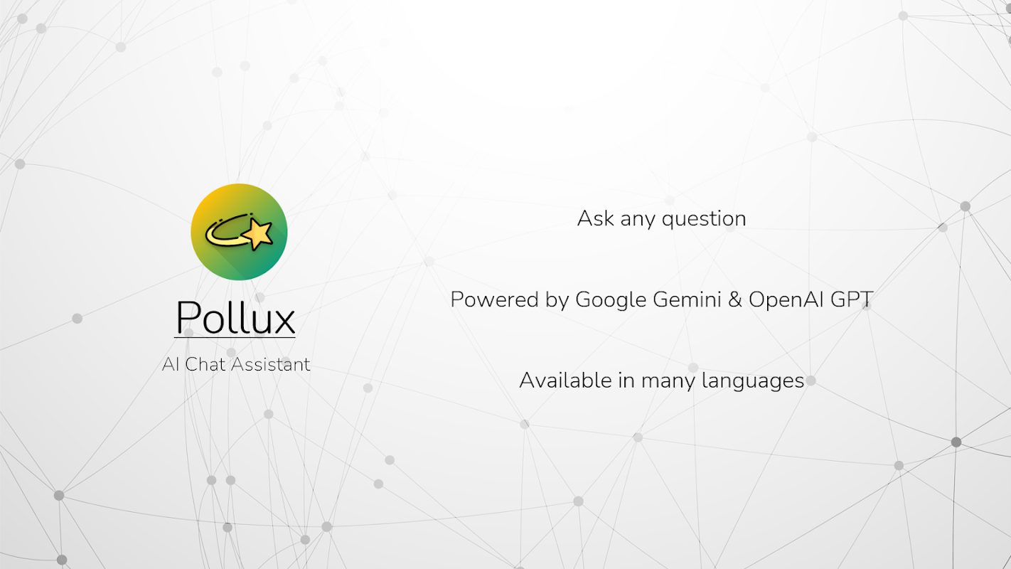 Pollux es una aplicación de chat con IA que utiliza inteligencia artificial para simular conversaciones humanas. Está diseñada para interactuar con los usuarios, comprender sus consultas y proporcionar respuestas relevantes. Pollux funciona con los modelos Google Gemini y OpenAI GPT.