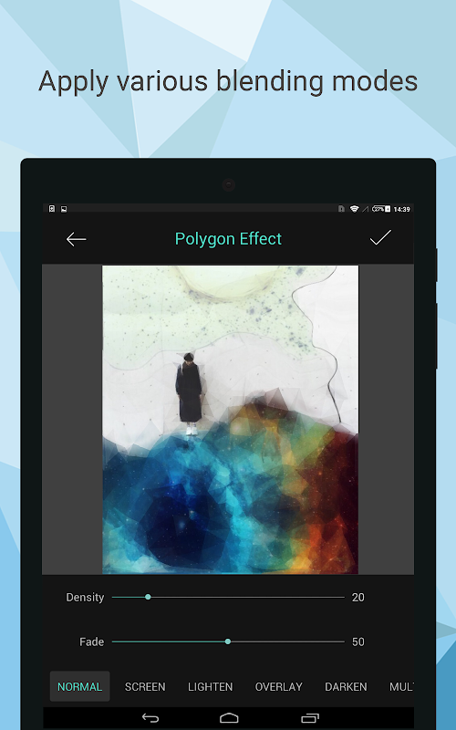 Sólo tiene que seleccionar una foto de la galería del dispositivo y que empiece la diversión. Juega un poco con los diferentes controles deslizantes y opciones de efectos y cuando haya terminado guardarlo y compartirlo! Efecto Polígono le permite ser parte de la tendencia del arte polígono y impresionar a sus amigos en unos pocos y sencillos pasos. No hay configuraciones complicadas y menús para navegar a través. Con Efecto Polígono desbloquear su potencial creativo es, literalmente, a su alcance.