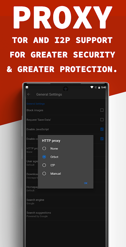 • Navegador que utiliza Orbot Proxy (active el soporte de proxy TOR para enmascarar su identidad y ubicación), proxy I2P o puede configurar su proxy personalizado manualmente.