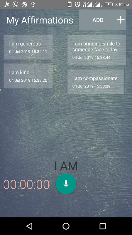 3)While moving to record another affirmation, take a long breath and say the affirmation. Give a Pause and record the second one and so continue in the same way. You may look device for ideas on your device. Then you can also look at the mirror and repeat and record what you want from yourself and your life. It's better to keep it short brief under 1-2 lines. Stay calm and pay attention to the affirmation you are speaking. You can record multiple affirmations in single recording or single affirmation also.