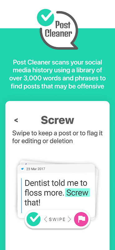 Post Cleaner privately analyzes your social media posts and identifies potentially offensive content. Profanity, vulgar phrases, and other objectionable language are identified, and then a left/right swipe function allows you to quickly sort through flagged content to dismiss or mark for editing.