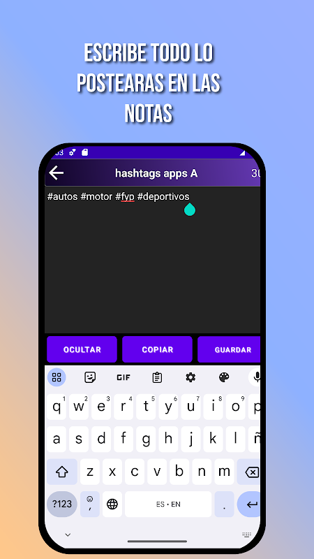 Postymax tiene un gestor de notas, donde puedes crear las notas que quieras y anotar que texto pondrás en tus posts como hashtags, menciones,etc. Para que luego puedas copiarlas al portapapeles con solo un toque.