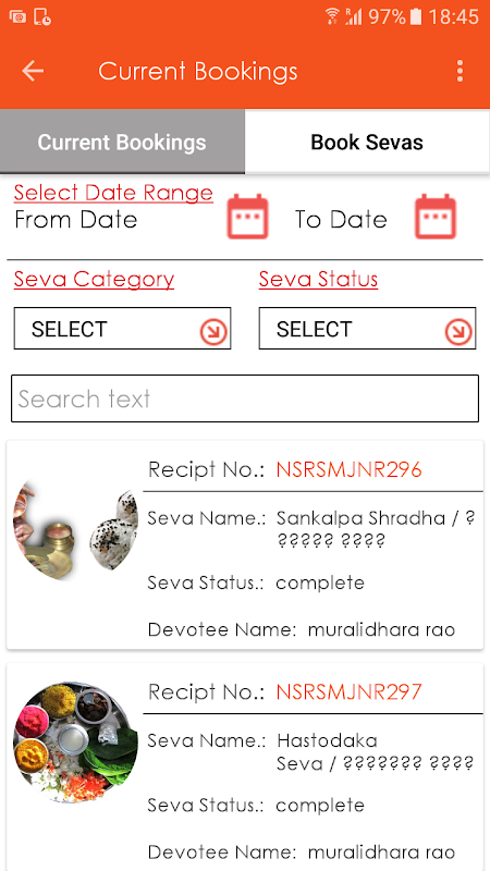 Now in this App administrators will be able to filter sevas by date range, seva category & seva status. Sevas can also be searched by devotee mobile number, name and receipt no.