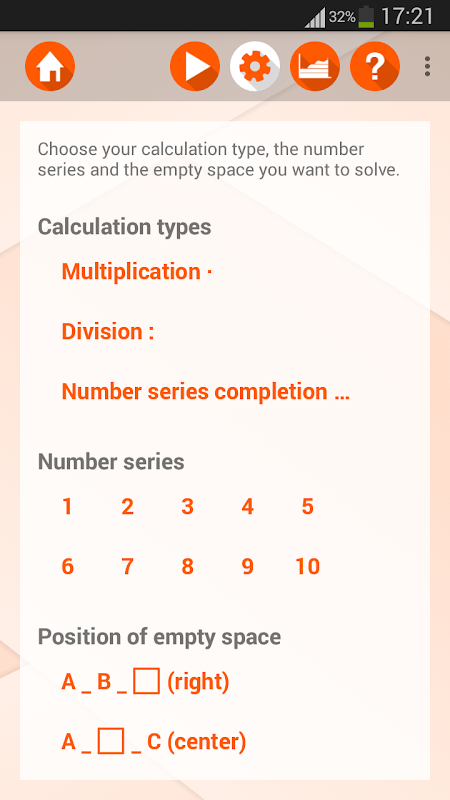 Practica concentrándote en tus demandas: selecciona qué problemas matemáticos deseas resolver: "multiplicación", "división" y "completación de series de números". Define qué partes de las tablas de multiplicar quieres practicar. Elige la posición de los espacios vacíos dentro de los problemas matemáticos que deseas llenar.