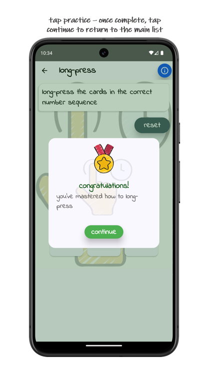 El objetivo de la aplicación es ayudar a los usuarios que son nuevos en Android a familiarizarse con varios gestos comunes que se usan en todas las aplicaciones, como tocar, tocar dos veces, presionar prolongadamente, desplazarse, deslizar y arrastrar y soltar.