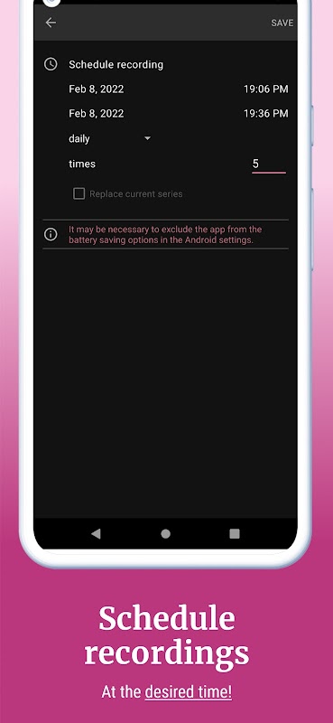 La funcionalidad principal de la aplicación es permitir al usuario programar grabaciones de audio en el momento deseado: las grabaciones de audio deben comenzar automáticamente en el momento seleccionado. La aplicación fue diseñada para controlar el sueño y propósitos similares (programar grabaciones de lecciones escolares, etc.). Para hacer eso, la aplicación debe poder grabar en segundo plano en el momento seleccionado, incluso si el usuario no está interactuando con el dispositivo.