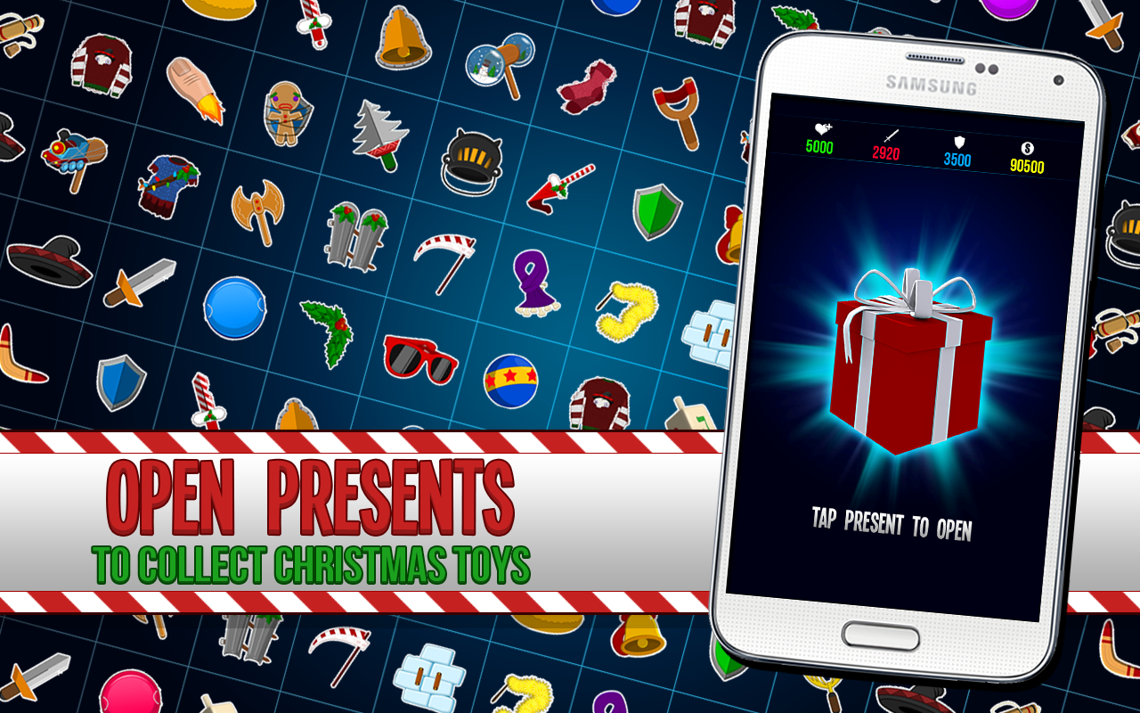 With the clear and present danger of the holiday season—cut throat shoppers, deadlines, monsters—one can never be too prepared. Stock up on swords, boomerangs, and weaponized yo-yos this holiday season as you wage battle against the dangers presented to you in gift form: killer spiders, xmas gingerbread men, gnomes, goblin kings, combative fruit cakes, and of course the fearsome Krampus. Strategize as you fight your way to victory on the score boards. Collect weapon stats or sell them for precious gold, being sure you’re always strong enough to defeat an endless stream of enemies.