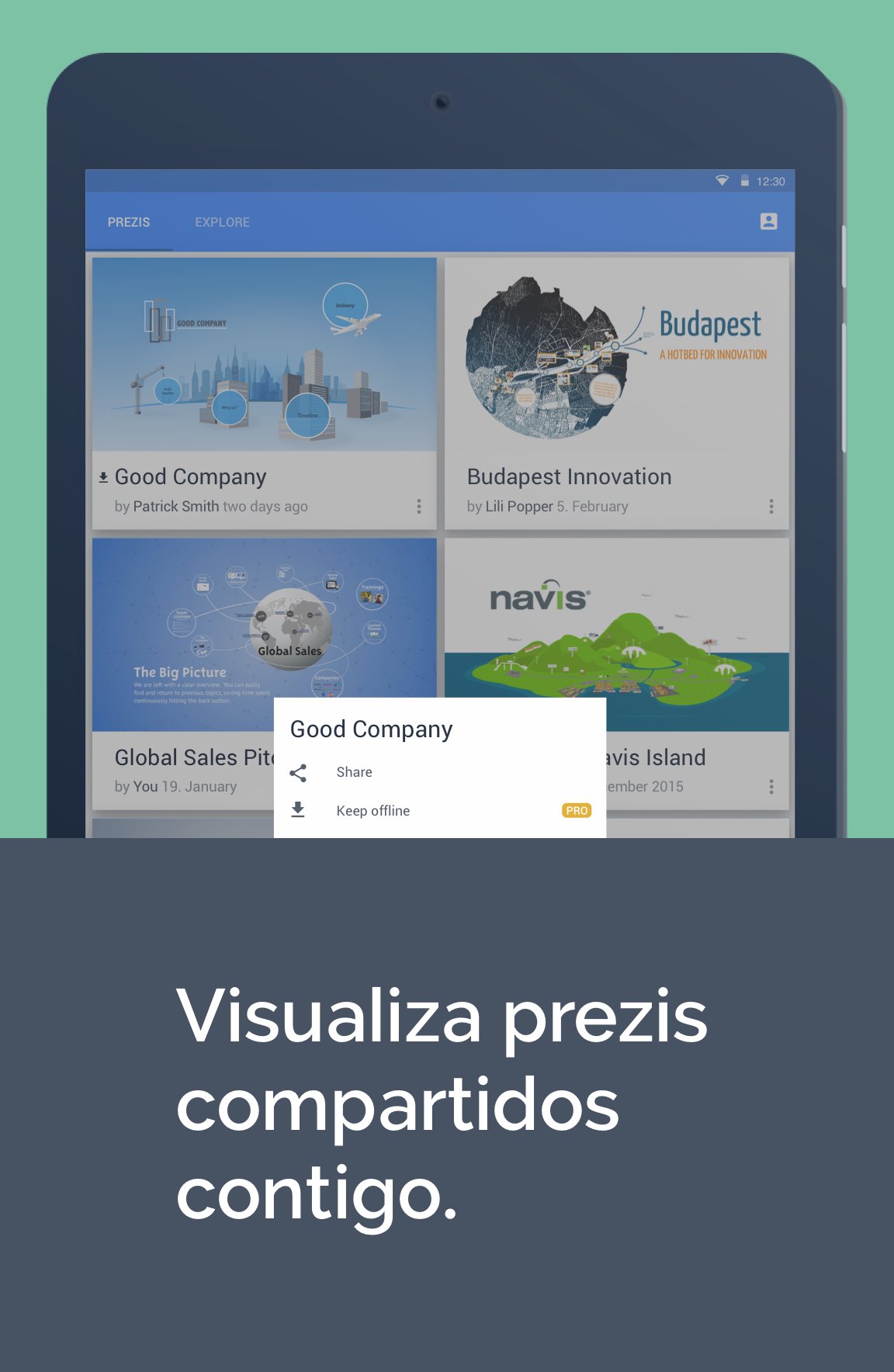 ¿Tienes una presentación, pero no dispones de tiempo para practicar? Prezi Viewer para Android es una app gratuita que te permite ver y presentar tus prezis donde quieras, cuando quieras. ¿Vas a una reunión importante o a la presentación de un gran proyecto? ¿Por qué no empleas el tiempo del tránsito en revisar tu presentación desde el teléfono o la tableta? Cuando llegues, conéctate a través de Chromecast y presenta en pantalla grande. Y por último, ya de vuelta a casa, ¿te imaginas que la persona que está sentada junto a ti resulta ser un cliente importante? Como puedes presentar tus prezis guardados sin necesidad de conexión a internet, nunca perderás un contacto. Con Prezi Viewer para Android, siempre estás preparado para presentar.