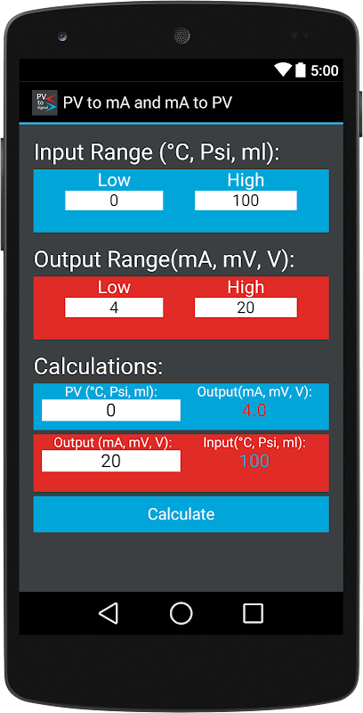 Status Instruments aplicación gratuita para convertir un valor de señal de proceso, en cualquier unidad de ingeniería, en una señal de control en amperios mili mili voltios, o voltios.