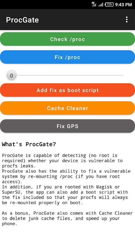 ProcGate es capaz de detectar (no se requiere root) si su dispositivo es vulnerable a fugas de procfs.