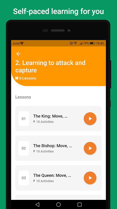 ¡Es hora de aprender cursos interactivos de ajedrez con resolución basada en actividades! Nuestros cursos tienen cientos de actividades de varios niveles de aprendizaje. Los diferentes tipos de actividades interactivas te ayudan a digerir la información fácilmente. 1) Actividad de Explicación: Esto te enseñará un concepto de manera concisa. 2) Actividad de captura: la forma más divertida y atractiva de aprender movimientos y capturas de piezas. 3) Actividad de rompecabezas: resuelve interesantes rompecabezas y tácticas desde una posición determinada. 4) Actividad MCQ: pruebe sus conocimientos con preguntas de opción múltiple basadas en cuestionarios. 5) Juega con la computadora: entrena tus habilidades practicando posiciones imprescindibles con la computadora.