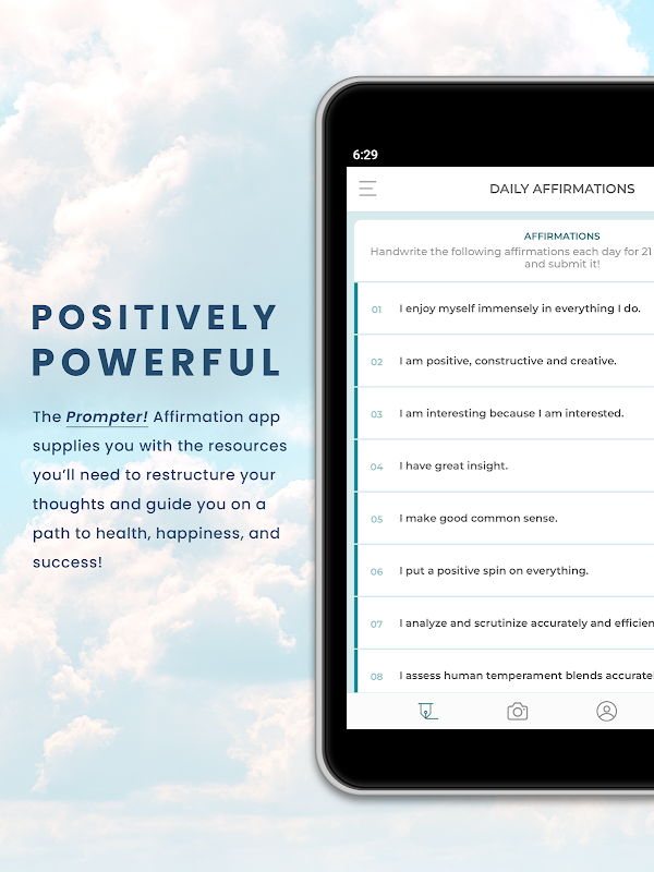 A menudo pensamos que el éxito crea una mentalidad positiva, pero eso es al revés: nuestros pensamientos determinan nuestras acciones. Si constantemente piensa que, por ejemplo, usted es promedio, esté en un ensayo de un patrón de pensamiento que perpetuará en su comportamiento. Tenemos la solución a este bucle de retroalimentación: La plataforma afirmación apuntador. Nosotros proveemos los recursos que necesita para reestructurar sus pensamientos y le guiará en el camino hacia la salud, la felicidad y el éxito. Ponemos a su disposición un conjunto único de afirmaciones cada 21 días que tienes que escribir a mano y enviar diariamente a través de la aplicación. Cuando usted afirma ideas positivas en el tiempo presente con intenciones deliberadas, que está construyendo la nueva habits.With mentales lo suficientemente ensayo, estas afirmaciones se convertirán en los reflejos. De aquí en adelante, tendrá ninguna duda de que usted es organizado, ya que tendrá ensayado la idea de que “yo soy muy organizada en todo lo que hago.” Ese es el poder de las afirmaciones.