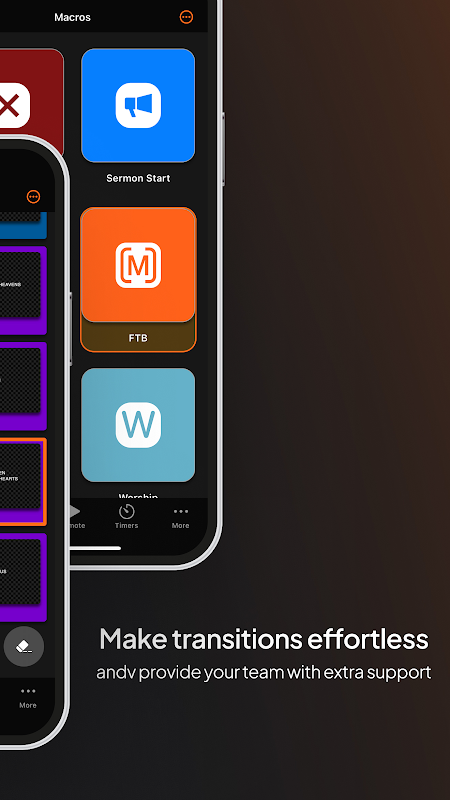 ProPresenter Remote es tu pase al control total. Ya sea que estés dando indicaciones en un concierto, ejecutando visuales en una conferencia, apoyando a un orador desde un lateral del escenario o preparando la letra justo a tiempo para la siguiente canción de alabanza, la app ProPresenter Remote te da todo lo que necesitas para liderar el momento.