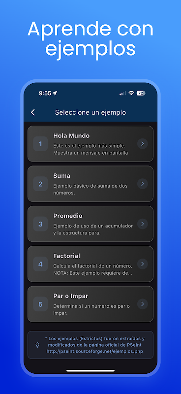Esta aplicación te permite escribir y compilar pseudocódigo utilizando el popular pseudolenguaje de PSeInt (español) y Visualg (portugués).