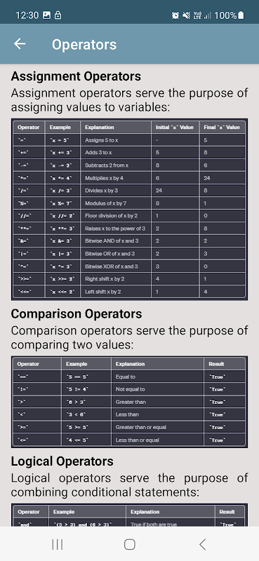 Sumérgete en el mundo de la programación Python con nuestra extensa aplicación de tutoriales, diseñada para principiantes y aquellos que buscan solidificar su comprensión de los fundamentos de Python. Esta aplicación es un recurso integral que cubre metódicamente todos los aspectos de la programación en Python.