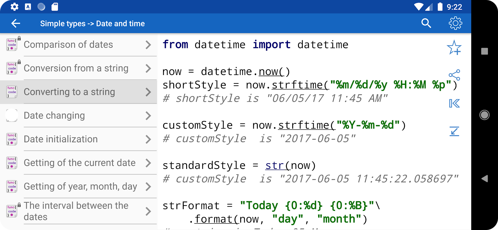✓ Aprender la sintaxis de Python 3 en ejemplos de código específicos. ¿Cómo obtener una subcadena? ¿Cómo declarar un método generalizado? Estos y más de 300 de otros ejemplos de código para Python están disponibles en la aplicación.