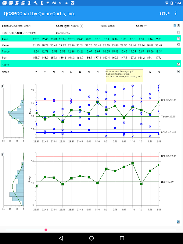 El software gráfico de control de calidad SPC es un gráfico SPC interactiva aplicación (6-sigma) dirigida a los profesionales de control de calidad (y estudiantes) que quieren ver los gráficos de control estadístico de la calidad estándar de la industria en sus dispositivos móviles. Los usuarios típicos supervisarán factores críticos de calidad en la fabricación, el proceso y las industrias de servicios, y mostrar los resultados en uno de los muchos tipos de gráficos compatibles. Tipos de gráficos incluyen: gráficos de control variables (XBar-R, XBar-Sigma, Individual-Range, y la mediana-rango), y atribuyen gráficos de control para el control de defectos (p-, NP, c-, u-, y gráficos DPMO) . El software calculará automáticamente los límites de control SPC utilizando datos históricos para el gráfico de control de variable admitidos y atribuir tipos de gráficos de control. Las alarmas pueden ser generadas por los límites estándar de control +3 sigma, o las reglas WECO (Western Electric). También será calcular los coeficientes de capacidad del proceso (Cp, Cpk) y los índices de rendimiento de proceso (PP, Ppk). Un conjunto de límites de especificación también se puede añadir a la tabla.