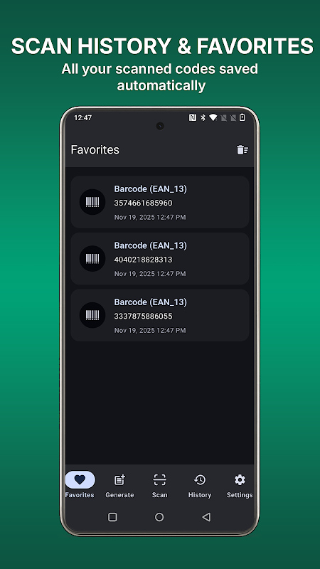 Todos los códigos de barras y códigos QR se guardan automáticamente y se organizan para un acceso rápido.