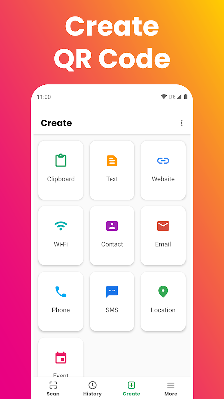 InstaScan QR Code Scanner también puede ayudarlo a generar códigos QR en múltiples formatos: dirección del sitio web, Wi-Fi, contacto, correo electrónico y muchos más.