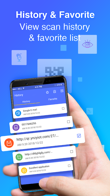 The QR / Barcode content scanned or created will be saved to history list automatically, which make it easy to use at next time. Also you can delete or edit the QR code / Barcode at any time.
