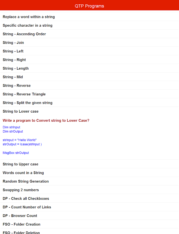 Te trae la colección de programas QTP y VBScript lleno en la aplicación, que son de gran utilidad para todos los que quieran prepararse para la entrevista y para aprender QTP Programación. Y usted puede preparar en cualquier lugar.
