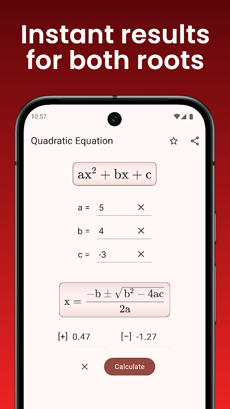 Esta aplicación de cálculo matemático te permite resolver de manera rápida y sencilla cualquier ecuación cuadrática o de segundo grado. Solo tienes que introducir los valores de las constantes a, b y c, y la calculadora mostrará al instante las soluciones posibles para la incógnita 'x'.