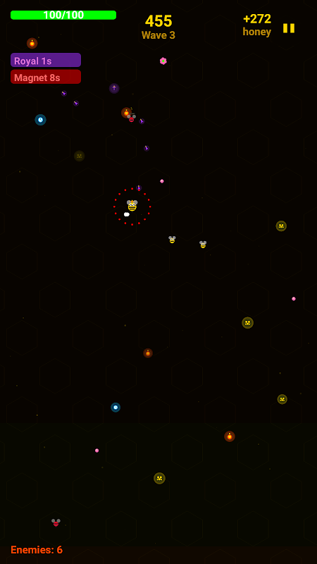 Toca y arrastra para mover a tu reina por el campo de batalla. Dispara automáticamente proyectiles con aguijón al enemigo más cercano, para que puedas concentrarte en esquivar ataques y recolectar recursos. Tus leales abejas obreras vuelan a tu lado, recolectando néctar y polen para impulsar tu esfuerzo bélico.