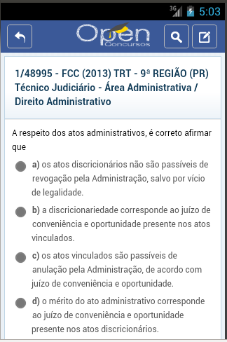 Com o OpenConcursos mobile você poderá estudar em qualquer lugar, em casa, no ônibus, no metrô, e para qualquer concurso. Os comentários feitos por outros usuários do site estão disponíveis para App (online), permitindo um maior aprendizado.
