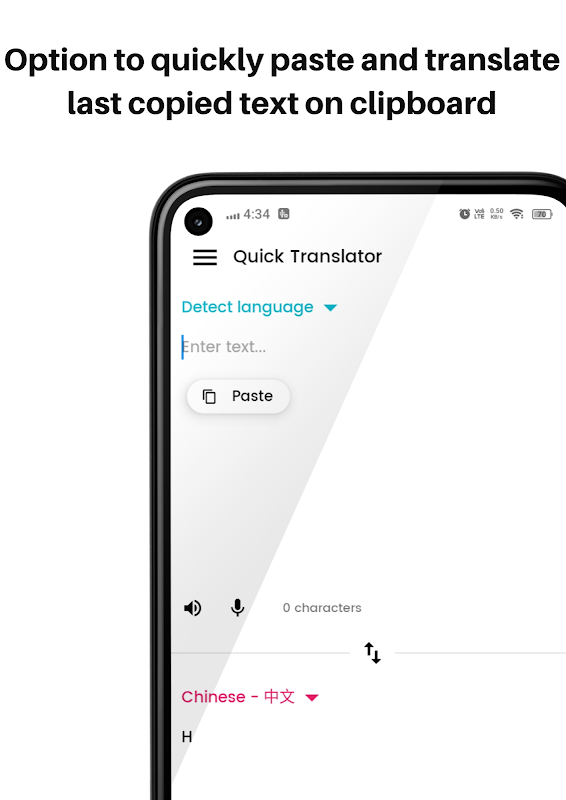 Quick Translator es un traductor para todos los idiomas que utiliza inteligencia artificial y algoritmos basados en aprendizaje automático para traducir texto de un idioma a otro. Detecta automáticamente el idioma del texto escrito y lo convierte a cualquier idioma deseado.