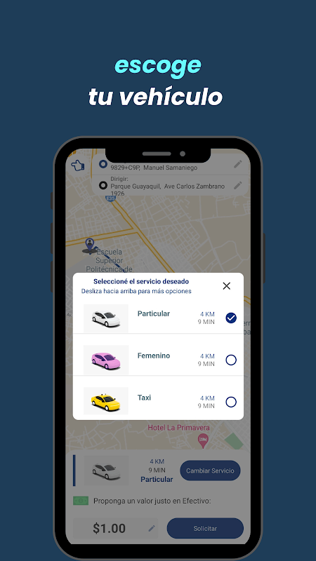 La app es muy fácil de usar y te permite seleccionar el punto de recogida y destino y el tipo de vehículo que necesitas para un servicio a tu puerta donde tú ofreces un valor justo por tu viaje o pedido.