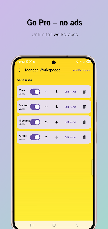 Organiza todo por espacio de trabajo (Airbnb, Turo, Marketplace, eBay, soporte, etc.).