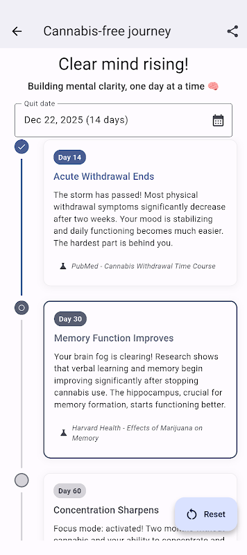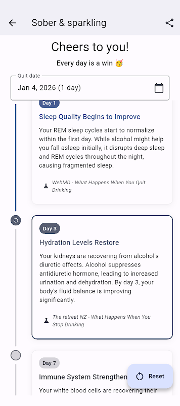 Cada hito está respaldado por investigaciones médicas de fuentes como el NHS, los CDC y revistas revisadas por pares. Observa mejoras reales al día, a los 3 días, a la semana, al mes y más.