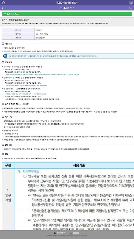 R&D 지원제도 핸드북은 기업의 기술혁신을 지원하기 위하여 정부와 공공기관의 기술개발 관련 지원제도 정보를 종합 제공하고자 조세, 출연, 기술, 인력, 금융, 인증, 판로 등 7개 분야에 대한 지원제도를 요약 정리하였습니다.