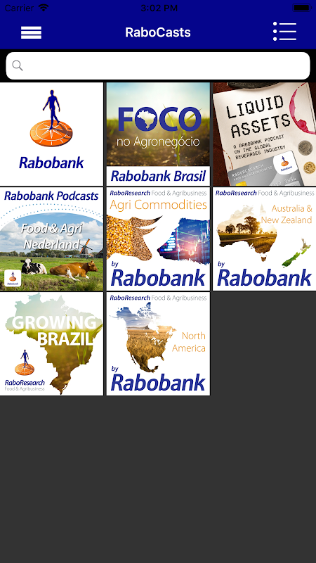 La red de podcasts de Rabobank incluye Agri Commodity Markets Research, Australia / New Zealand Food & Agribusiness Research, Foco no Agronegócio - Pesquisa Setorial (en portugués), Food & Agri Nederland (en holandés e inglés), Brasil en crecimiento, activos líquidos: una industria de bebidas Podcast, Investigación sobre alimentos y agronegocios de América del Norte y RaboWorld - Creciendo un mundo mejor juntos.