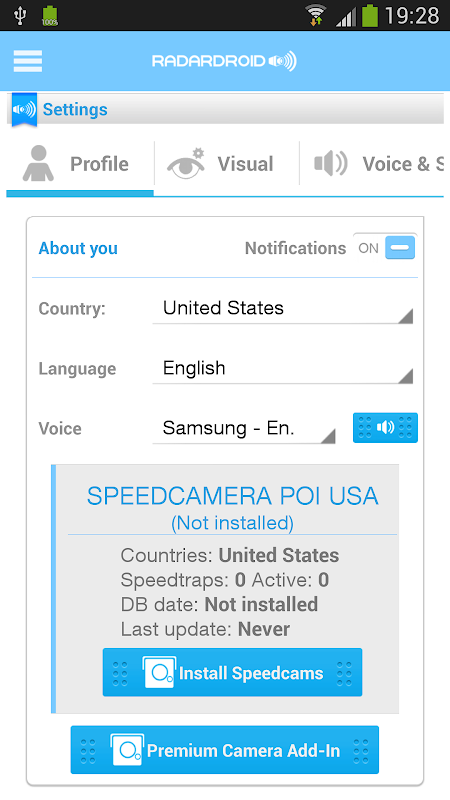 GPS speed camera warning app for Android devices. Radardroid will give a visual and audible warning when you approach any fixed or mobile speed camera in the app database. This app will reduce possible speeding tickets thanks to the ever increasing available features. We do not condone speeding and will not be held responsible for anybody prosecuted for breaking the law.