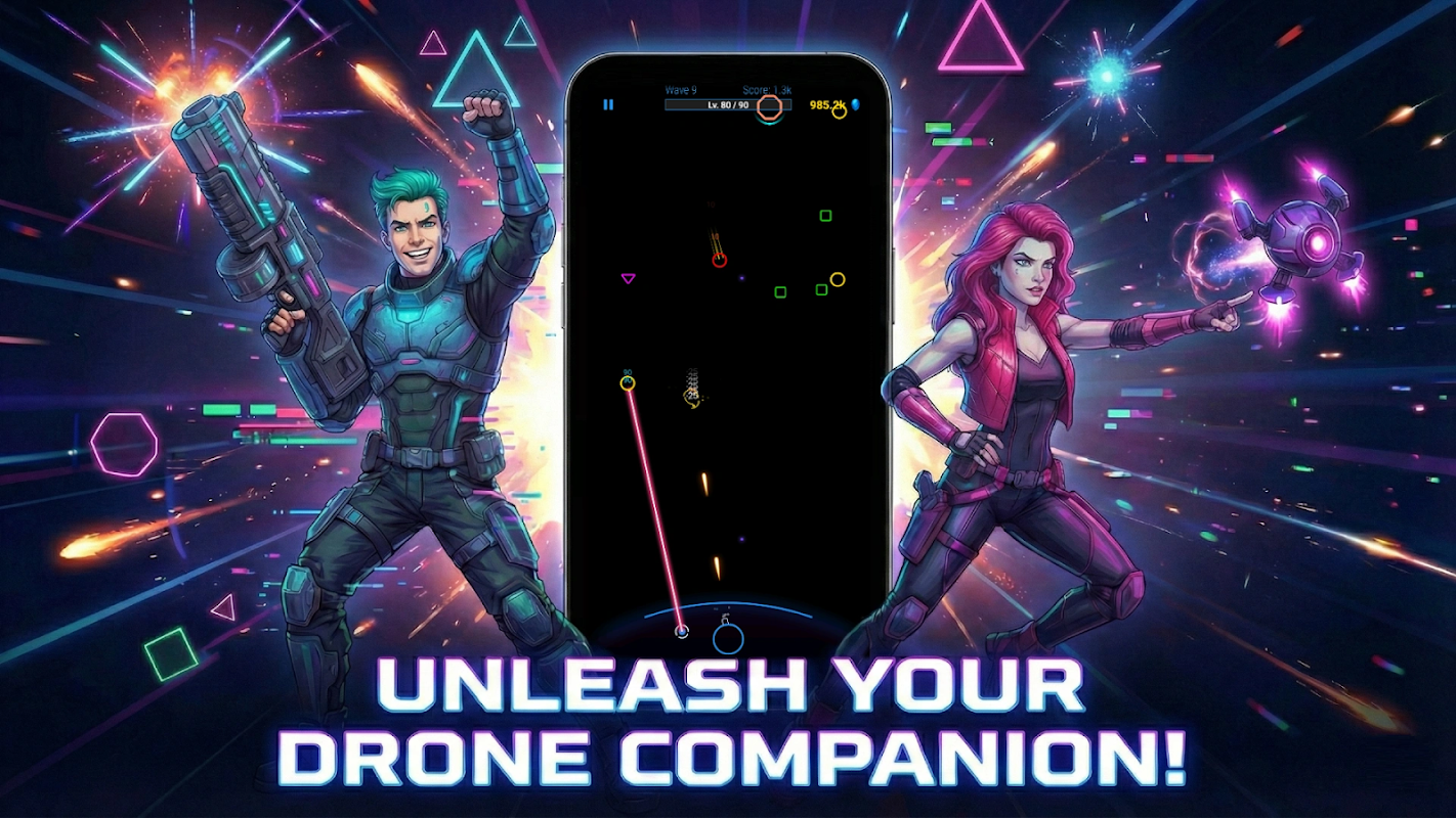 No tienes que luchar solo. Desbloquea y despliega drones compañeros autónomos que flotan inteligentemente cerca de tu cañón, posicionándose dinámicamente donde la densidad de amenazas es mayor.