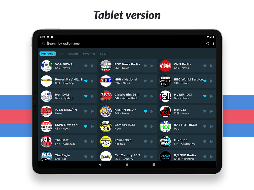 ¡Escucha todas tus estaciones de radio favoritas como FOX News Talk, VOA Learning English, Bloomberg, New York Hott, 100hitz Top 40 Hitz, 80’s 90’s Music, Jazz24, Chicago Public, USA Dance, BBC World Service, Love Songs 247, Hot Country B104.7, MyTalk 107.1, Rock 92, NewsTalk 99.1 y muchas más! Y no importa en qué ciudad o país te encuentres, ¡puedes escuchar tu estación de radio local favorita desde cualquier parte del mundo!