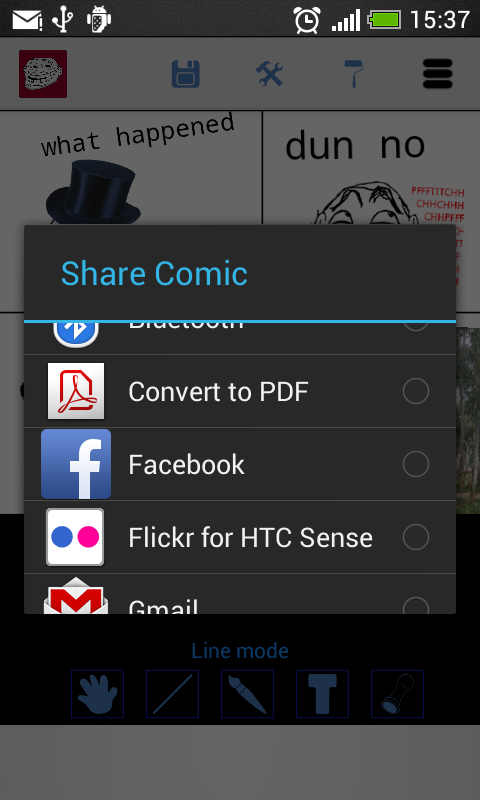 Using this menu you'll have different options depending on the mode you are in, for example in Manipulate mode you can add images, and in Draw mode you can set the color and brush width.