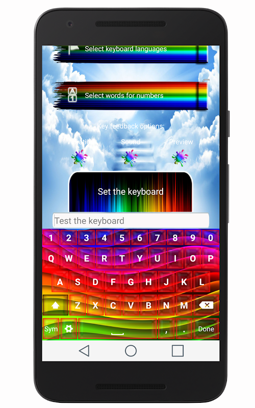 Si usted quiere tener un teclado de arco iris de colores que puede hacerlo bien aquí GRATIS! Poner todos los colores de la pantalla y enviar un mensaje de texto con estilo! Obtener el teclado de su arco iris y añadir algunos efectos de sonido que hará que sea aún más divertido! Descargarlo en sus dispositivos Android™ y seleccionar su favorito, de una colección de temas SMS Pro! Seguir adelante y probarlo de inmediato!