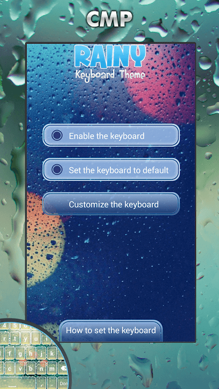 - Volver a la aplicación y seleccionar "Establecer el teclado por defecto" botón y elija la opción Lluvioso Temas de Teclado.