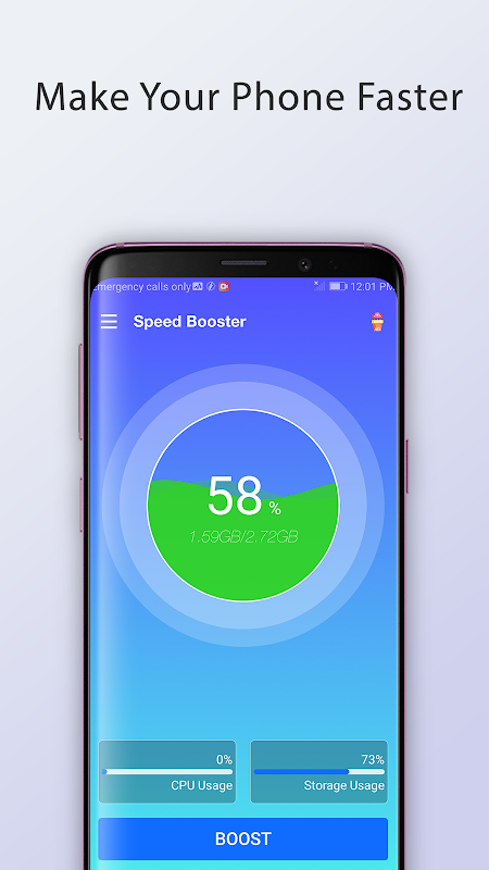 Aumentador de presión de velocidad le ayudará a su teléfono optimizar la CPU, la RAM y la memoria, ayudar a acelerar el teléfono más rápidamente y gratis la memoria ram para aumentar la memoria ram. Se libera y aumenta la cantidad de ram disponible para su dispositivo aumentar la memoria ram para android, haciendo que el teléfono ejecute más rápido y estable.