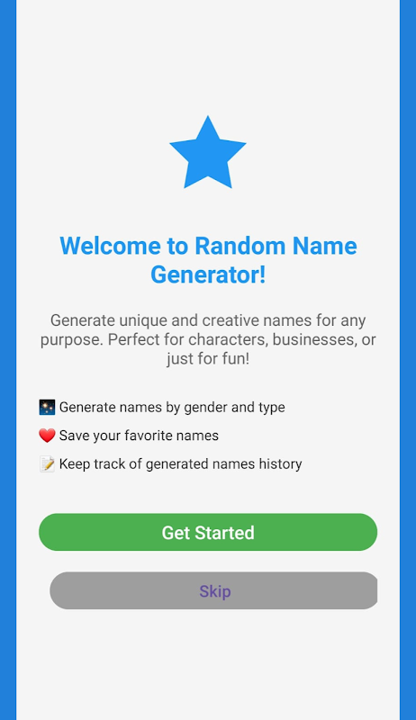 ¡Descubre la app Generador de Nombres Aleatorios! Crea nombres únicos para personajes, negocios, mascotas o cualquier proyecto creativo. Elige entre opciones de nombre masculino o femenino, con múltiples tipos de nombre, incluyendo nombres completos, solo nombre, apellidos y nombres de usuario. Guarda tus favoritos, revisa tu historial de generaciones y busca resultados anteriores. Cuenta con una interfaz moderna y atractiva con animaciones fluidas e integración personalizada. ¡Perfecta para escritores, desarrolladores de juegos, padres y cualquiera que necesite inspiración para nombres creativos!