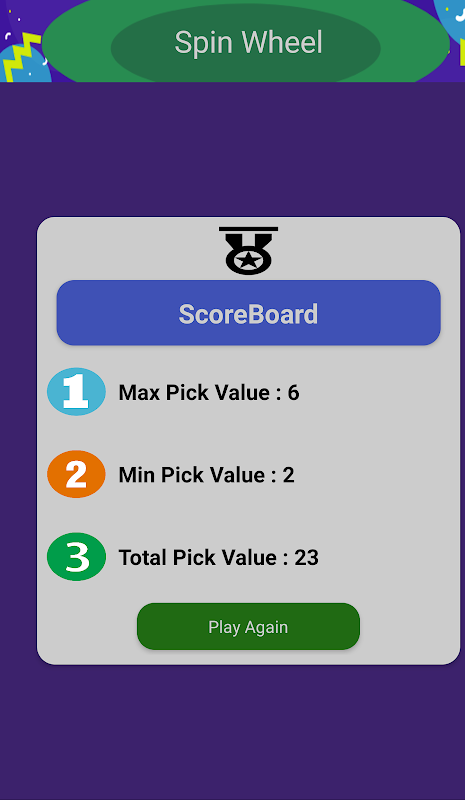 Gira la rueda máximo 5 en unas veces. Y selección automática de números aleatorios desde la rueda. Puedes ver tus puntuaciones después de completar 5 giros. En ScoreBoard, el resultado generará el valor de selección máximo y mínimo con el valor de selección total.