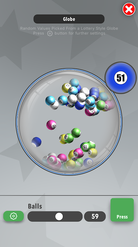 Observe las bolas de bingo rebotando en su pantalla y seleccione la cantidad de bolas para elegir. La aplicación también incluye una cuadrícula para rastrear las bolas extraídas, que se puede ocultar si se desea. Perfecto para noches de bingo familiares o sorteos de lotería informales.